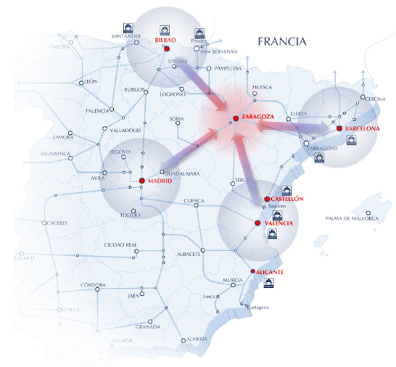 En este sentido, Zaragoza resulta un nodo logístico e infraestructural de gran relevancia en este cuadrante noreste peninsular, puesto que se ubica en el cruce de estos dos corredores principales señalados y equidistante tanto por carretera como por ferrocarril de los principales núcleos que conectan: Barcelona, Bilbao, Madrid y Valencia.